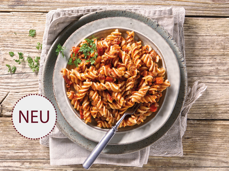 Spannende Produktneuheiten wie die "Fusilli mit veganer kein-Hack-Bolognese" (Foto) sind immer heiß begehrt. Wir sagen Ihnen, welche Neulinge aus dem frisch erschienenen Saisonkatalog Sommer Sie unbedingt einmal ausprobieren müssen!