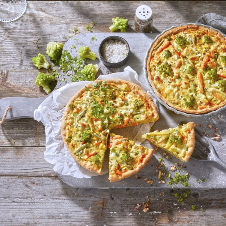 Guss über das Gemüse gießen und die Quiche im vorgeheizten Backofen bei 200 °C Ober-/Unterhitze Eco (180 °C Heißluft Eco) ca. 50 - 60 Minuten backen. Falls diese anfängt zu dunkel zu werden, mit Alufolie abdecken.