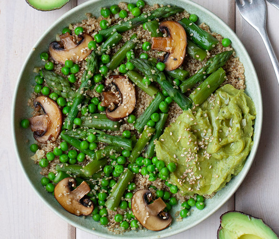 Die Avocado in Würfel schneiden, mit Zitronensaft beträufeln und ebenfalls in die Pfanne geben. Vor dem Servieren alles mit Salz und Pfeffer abschmecken. Auch diese Bowl lässt sich sehr gut mit Quinoa oder Wildreis kombinieren.