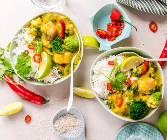 So ein Curry ist doch immer eine gute Idee. Wir servieren es heute wunderbar vielseitig mit gleich drei unterschiedlichen Fischsorten: Kabeljau, Heilbutt und Seelachs machen dieses Gericht ganz besonders - selbstverständlich funktioniert es aber auch nur mit einer der drei Fischsorten. Da wir auf unsere eismann Möhrencremesuppe mit Ingwer als Grundlage für das Curry zurückgreifen, muss unsere Variante nicht lange einkochen werden und hat bereits ein wunderbares Aroma, welches wir später nur noch verfeinern.
