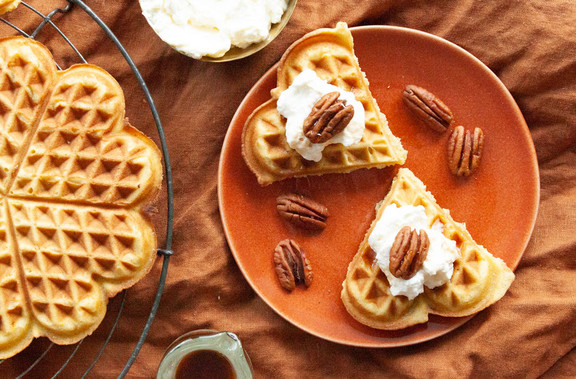 Wer Waffeln mag, wird diese Variante lieben. Durch den Kürbis werden sie leicht nussig. Zusammen mit Sahne, Ahornsirup und Pekannüssen sind diese Waffeln einfach perfekt für gemütliche Zeiten im Herbst.