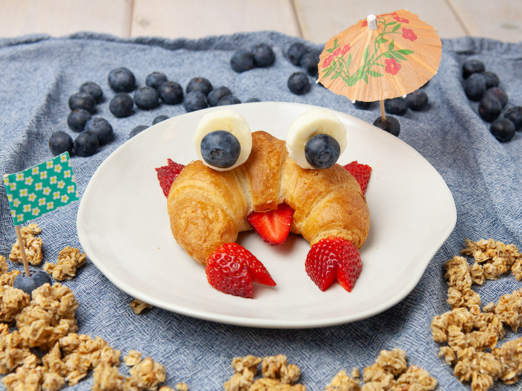 - Schneide die Banane in Scheiben und stecke mit Zahnstocherstücken die Blaubeeren auf die Bananenscheiben. Diese befestigst Du im Croissant, sodass die Krabbe ein richtiges Gesicht bekommt.