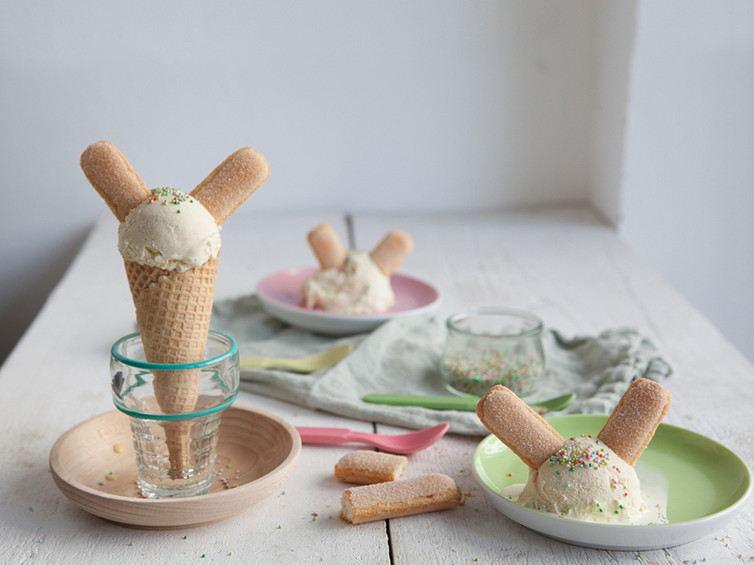 Ein echter Hingucker auf dem Ostertisch: Aus einer Kugel Vanilleeis wird im Nu ein kleiner Osterhase. Du brauchst: