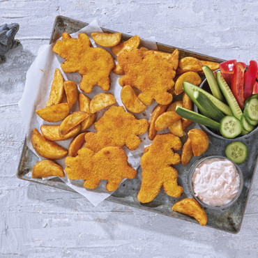 Hier sind die Dinos los – mit knusprig paniertem Hähnchenfleisch! Ca. 14 zarte Dino-Formen aus besonders fein zerkleinertem, flüssig gewürztem Hähnchenfleisch – perfekt portioniert für kleine Genießer. Und mit unseren knusprigen Kartoffelspiralen freuen sich auch die großen Entdecker auf echten eismann-Genuss!