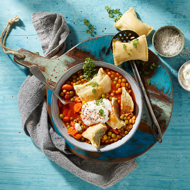 In kochende Brühe oder Salzwasser geben 1 x aufkochen und im geschlossenen Topf bei mittlerer Hitze ca. 20 Minuten ziehen lassen.