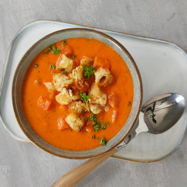 Vollreife Tomaten bilden die geschmackliche Basis dieser beliebten Suppe. Fruchtig-cremig im Geschmack mit feinen Tomatenstückchen erhält die Rezeptur zur Verfeinerung eine würzige Basilikumnote. Als Vorspeise oder sättigende Mahlzeit genauso köstlich wie als Grundlage für kreative Saucenkreationen zu Pasta, Fisch oder Fleisch.