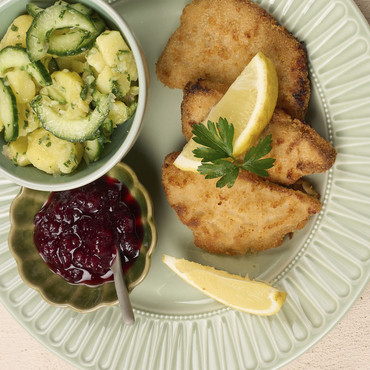 nach österreichischer Rezeptur mit 40 % Panade, vorgebacken, mit 8% Flüssigwürzung