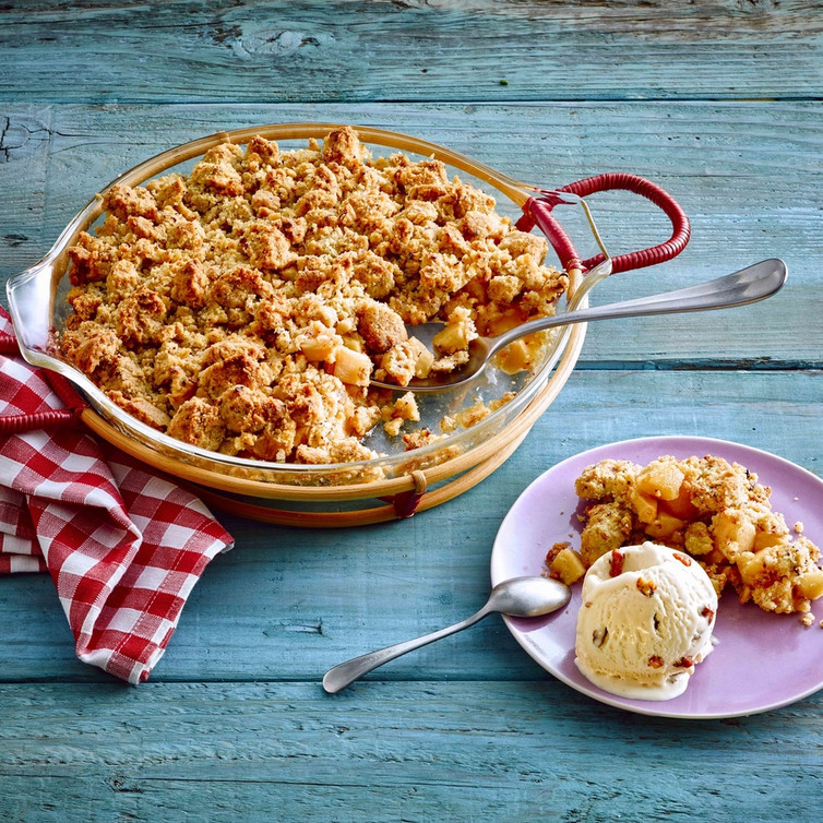 Die Apfelstücke in eine Auflaufform geben und mit den Streuseln bestreuen. Im vorgeheizten Backofen etwa 35-40 Minuten knusprig backen.