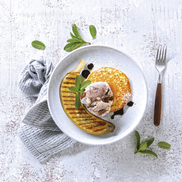 Gegrillte Pancakes mit Banane und Eiscreme anrichten, wer mag dekoriert den Teller noch mit Schokosauce.