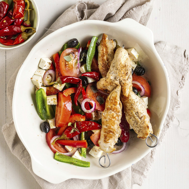Die Hähnchen-Filetspitzen flach auf die Spieße ziehen, bei direkter Hitze sehr kurz im geschlossenen Grill grillen und erst danach mit Oregano und frischem Pfeffer würzen. Mit dem Bauernsalat zusammen anrichten.