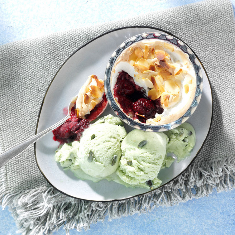 Eiweiß mit übrigem Zucker, Salz und Zitronensaft sehr steif schlagen, auf dem Dessert verteilen, mit Mandelblättchen bestreuen und im vorgeheizten Backofen bei 250 °C Ober-/Unterhitze (230 °C Umluft) ca. 3 - 5 Minuten goldbraun überbacken.