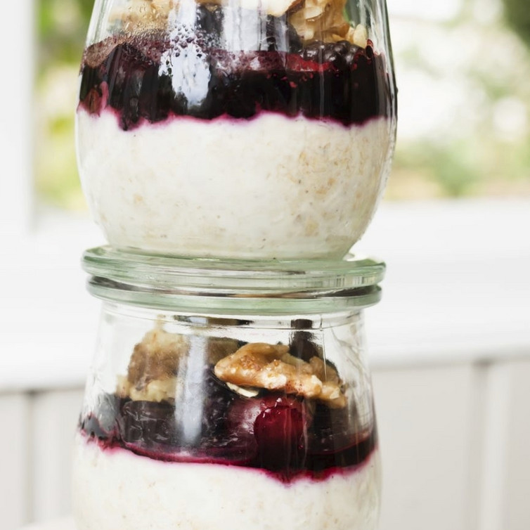 Die Vollkornhaferflocken mit Milch bedecken und quellen lassen (ca. 30 Minuten oder am Vorabend).