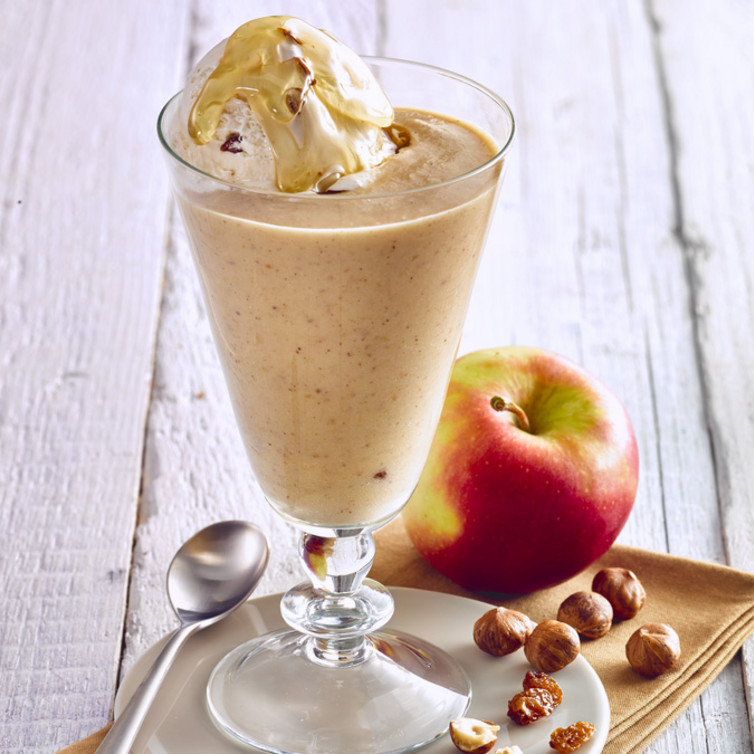 Alles mit einem Pürierstab schaumig mixen und auf 4 Gläser verteilen. Je eine Kugel Walnuss Eis hinein geben.