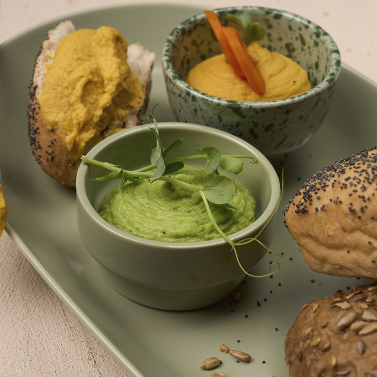 Brötchen mit Avocado-Erbsen-Creme und Kichererbsen-Humus