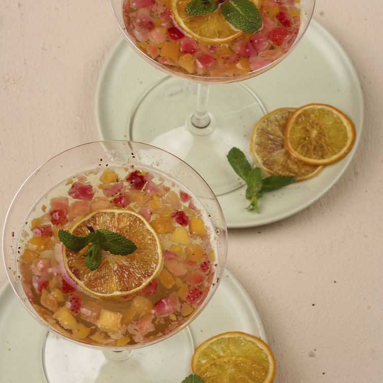 Die bunten Früchte-Minis in elegante Sekt- oder Champagnergläser füllen, mit Mango Likör auffüllen und mit spritzigem Sekt aufgießen. Mit einer kandierten Orangenscheibe und frischem Minzblatt garnieren und servieren.