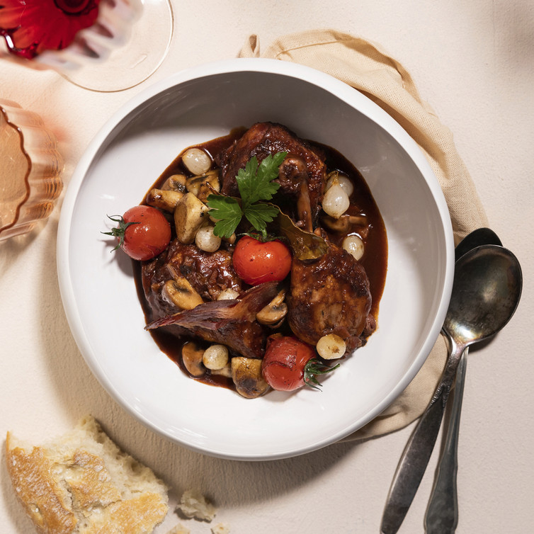 Champignons mit einem Küchentuch putzen und je nach Größe halbieren oder vierteln. In einer Pfanne mit etwas Rapsöl ca. 4 bis 5 Minuten anbraten. Die Perlzwiebeln mit der Petersilie unterheben. Coq au vin zusammen mit der Sauce und den gebratenen Champignons auf Teller anrichten.