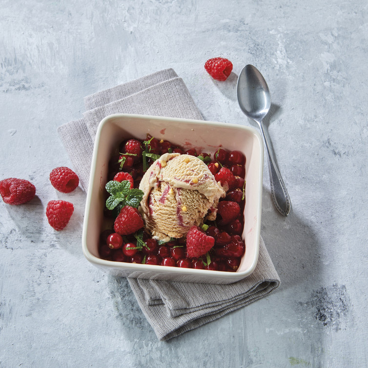 In einem Schüsselchen den Beerensalat mir einer Kugel Eis Linzer Torte anrichten und mit Zitronenmelisse dekorieren.