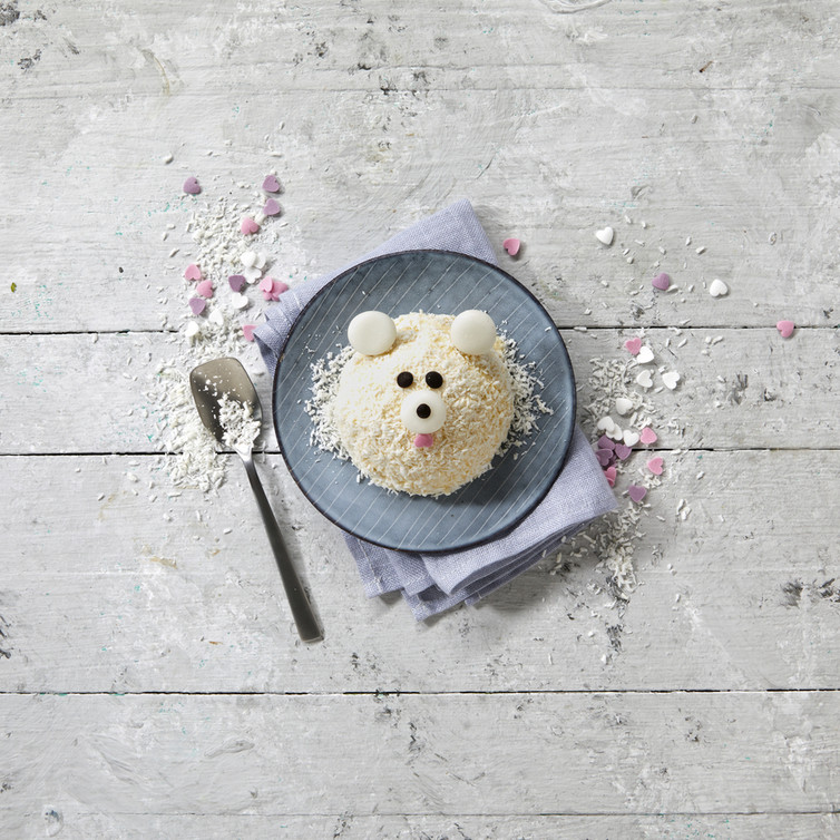 Das Eis im Gefrierschrank lassen bis es serviert wird. Wer mag, streut dann auf die gefrorenen Teller Kokosflocken oder weiße Schokostreusel und setzt die Eisi Eisbärkugel mitten hinein.