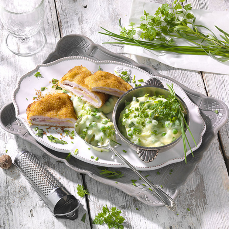 Erbsen-Kartoffelpüree " fines herbes" & zartem Cordon Bleu