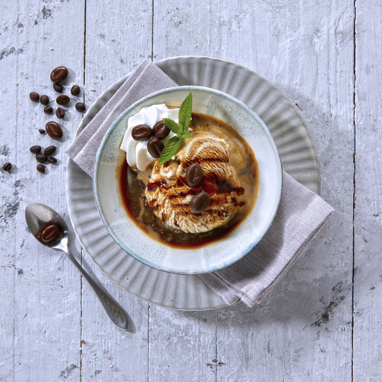 Eine große Kugel Espresso Crema auf den Espresso setzten. Das Eis mit Mocca Likör, Schlagsahne und schokolierten Kaffeebohnen dekorieren.
