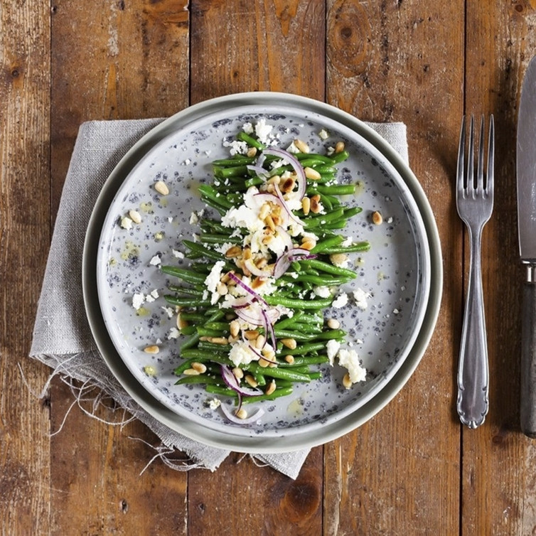 Die noch warmen Prinzessbohnen auf Teller anrichten, mit dem vorbereitetem Schafskäse-Masse bestreuen und mit Pinienkernen dekorieren.