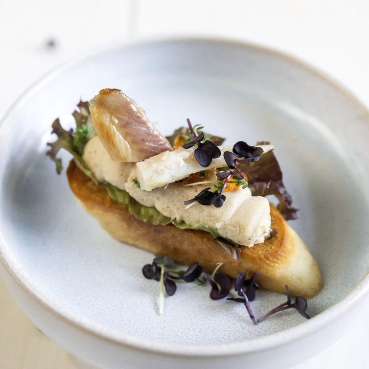 Das Räucherforellenmousse mit einem Spritzbeutel auf das mit Lollo Rosso verzierte Landhausbaguette auftragen. Die übrige Räucherforelle in kleine Würfel schneiden und darüber streuen. Abschließend mit Kresse und Forellenkaviar garnieren.