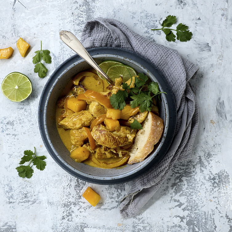 Das fruchtige Hähnchen-Curry heiß servieren, nach Wunsch mit frischem Koriander garnieren und mit Reis, Naan-Brot oder unserem Fladenbrot servieren.