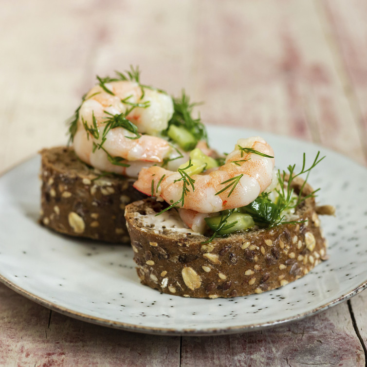 8 Scheiben aus den Mehrkornstangen herausschneiden und mit der gesalzenen Butter bestreichen. Darauf die Garnelen mit den Gurken türmen. Mit einer Garnele mit Schwanzsegment und Dillstängel dekorieren, ggf. mit einem Zahnstocher die Garnele fixieren.