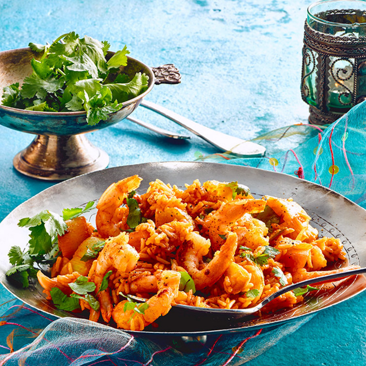 Zupfen Sie die Kräuter klein und geben die Hälfte dieser mit den Tomaten und den Garnelen zum Reis hinzu. Erhitzen Sie alles und würzen nach Belieben mit Salz und Pfeffer. Streuen Sie die restlichen Kräuter über das Gericht.