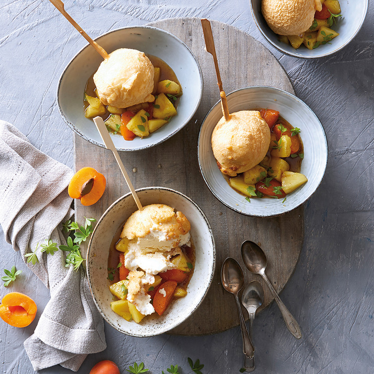 Die ausgebackenen Eiskugeln mitsamt den Spießen in Dessertschalen geben, die lauwarmen Früchte dazugeben und servieren.