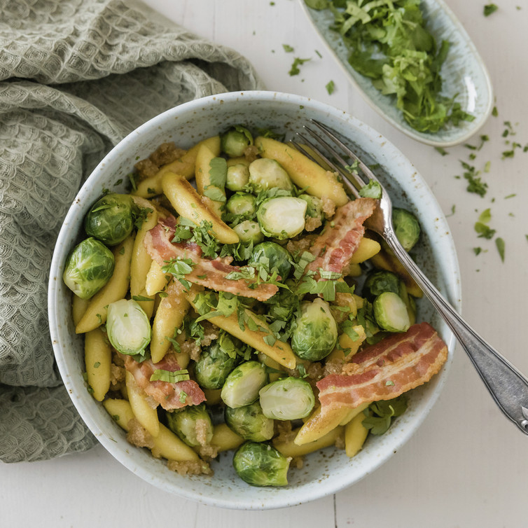 Gebratene Schupfnudeln mit Rosenkohl und Butterbröseln