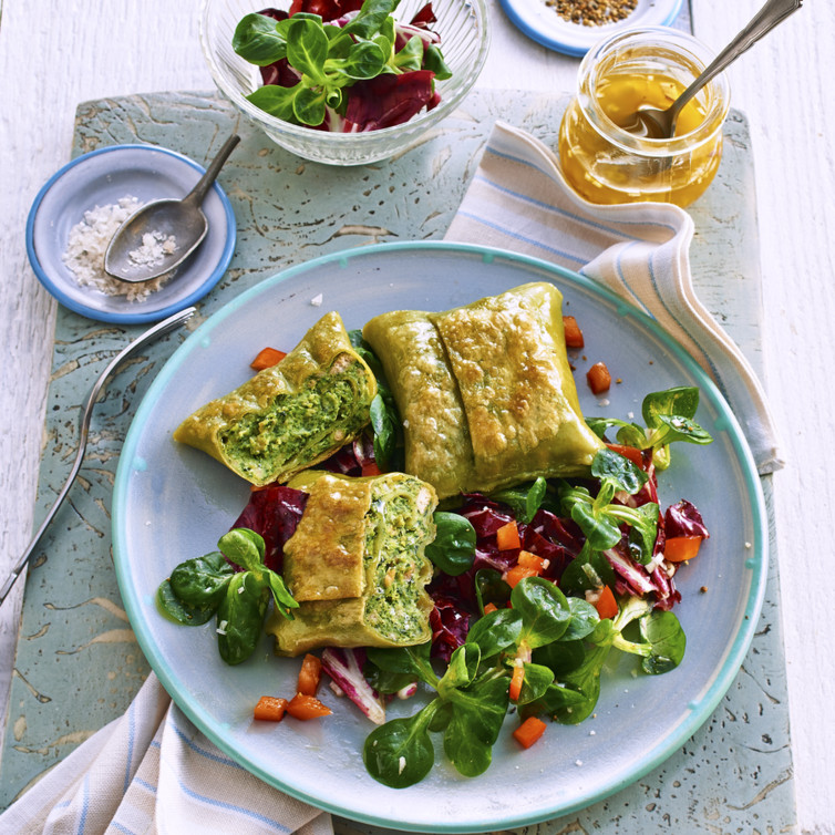 Die Maultaschen schräg einmal durchschneiden und noch warm auf den Salat setzen, sofort servieren.