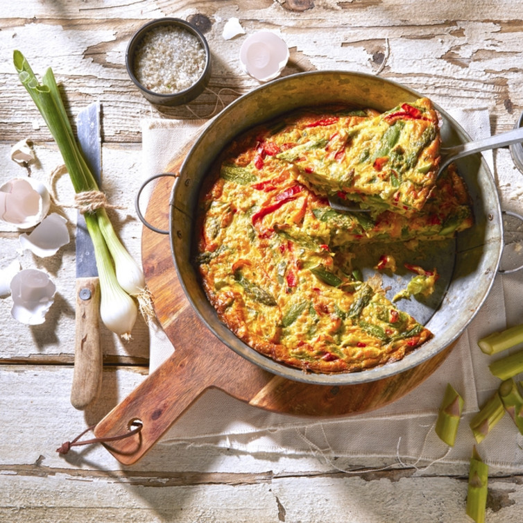 Frühlingszwiebeln waschen, putzen und in feine Ringe schneiden. Spargelstangen etwas antauen lassen und vierteln. Paprikastreifen in erhitztem Öl in einer backofengeeigneten Pfanne anbraten. Spargel und Lauchzwiebeln dazugeben und andünsten.