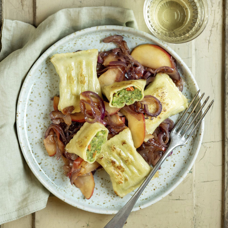 Die Maultaschen in der Zwiebel-Apfel-Mischung schwenken.
