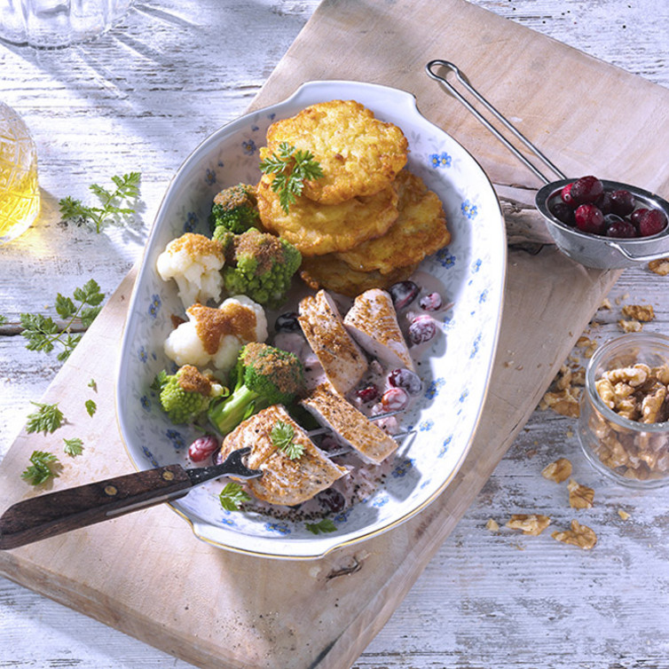 Auf vorgewärmten Tellern die Putenschnitzel mit den Röstinchen und dem Gemüse hübsch anrichten.