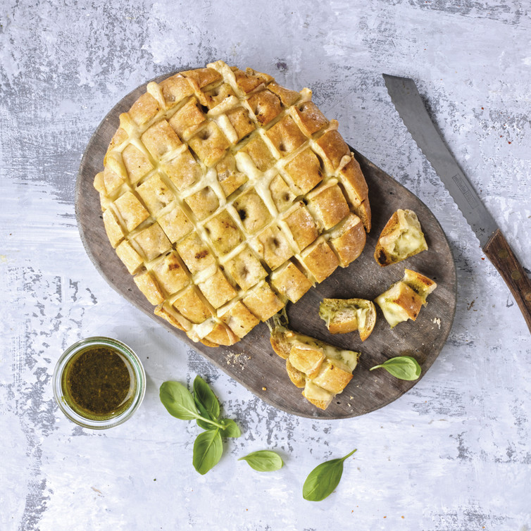 Brote auftauen lassen. Mit einem scharfen Messer die Brote der Länge wie auch der Breite nach bis zum Boden aufschneiden, aber nicht durchschneiden.