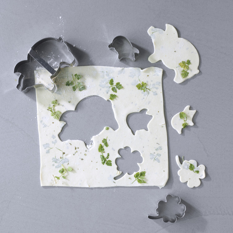 Eine Arbeitsplatte leicht bemehlen und die aufgetauten Blätterteigplatten bis zur 1 1/2 fachen Größe ausrollen und mit Glücksausstechern (Schweinchen, Kleeblatt, Schornsteinfeger) Motive ausstechen und auf ein Backpapier legen.