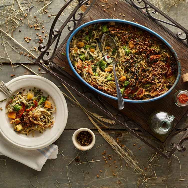 Eine ausgewogene Ernährung basiert auf dem Zusammenspiel aller Zutaten in einem Gericht, so dass der Körper die Energie bekommt, die er auch tatsächlich benötigt. Vollkornprodukte, Gemüse und Körner oder Saaten unterstützen zusätzlich das „Satt“ Gefühl. Mit dieser gratinierten Vollkornspaghetti-Pfanne gönnen Sie sich eine kleine Wellness-Oase zu Hause.