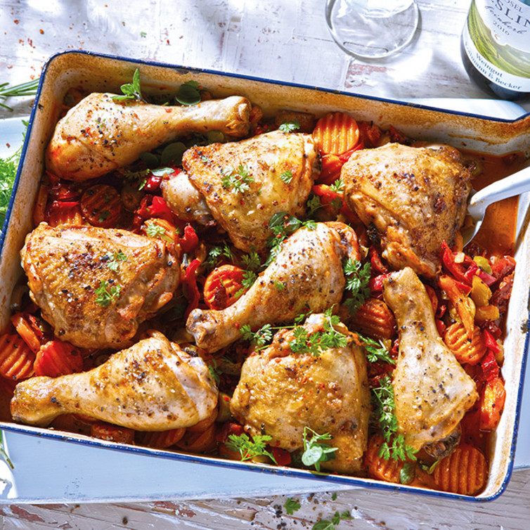 Dazu Rosmarinkartoffeln (e9413)oder Bauernbrötchen italienischer Art (e9808). Beide können direkt im Ofen mit zubereitet werden.