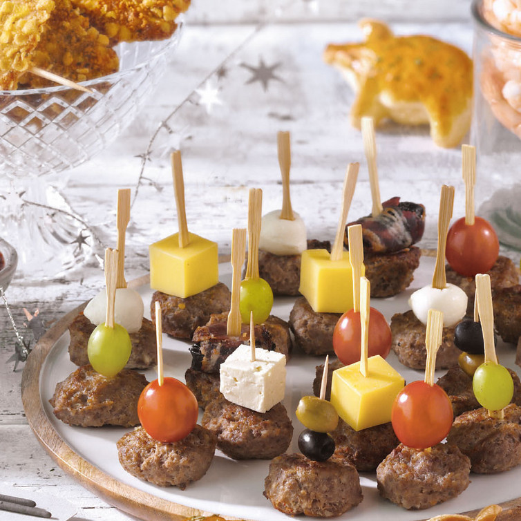 Nun nach Lust und Laune die Zutaten jeweils mit den Minifrikadellen auf die Spieker stecken und bunt auf einer großen Platte oder einem Holzbrett anrichten.