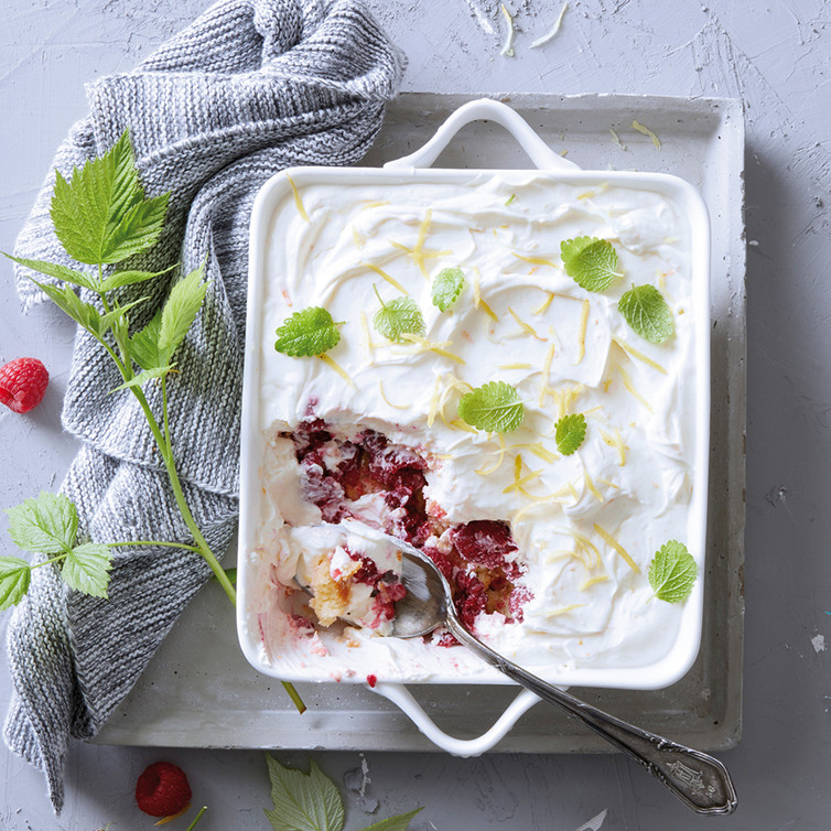 Die Zitronenküchlein längs durchschneiden und in eine passende höhere Auflaufform legen. Mit dem Orangensaft beträufeln und die Himbeeren darauf verteilen.