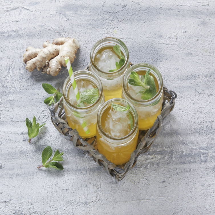 Nach Belieben mit Mineralwasser aufspritzen oder mit abgekühlten Minztee auffüllen. Großzügig mit Minzblättern dekorieren.