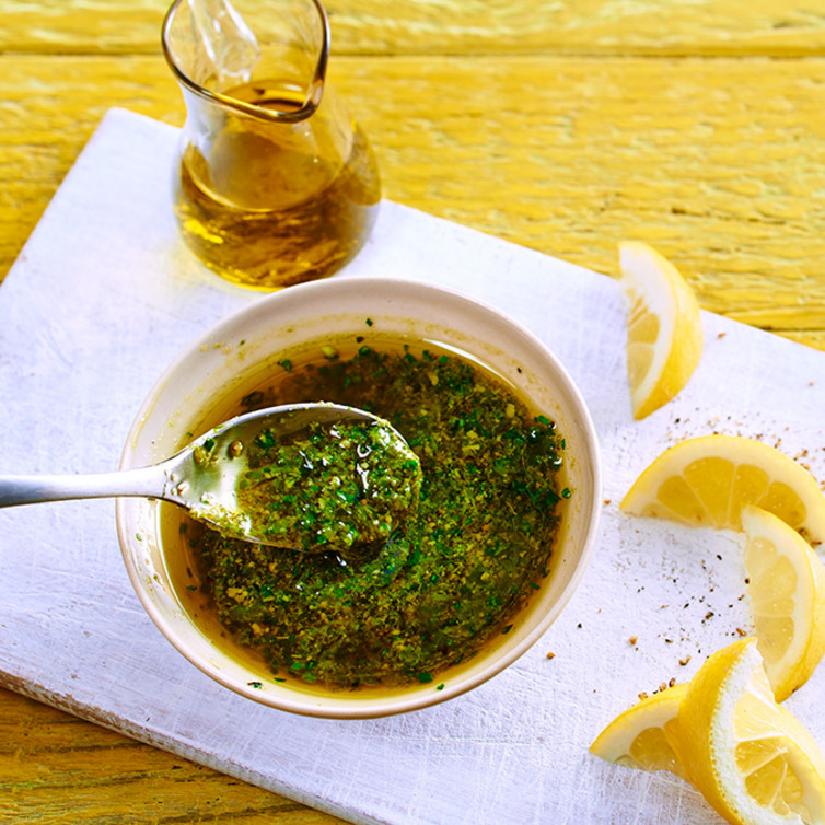 Rühren Sie das Olivenöl darunter und schmecken alles mit einem Spritzer Zitrone und frisch gemahlenem Pfeffer ab.
