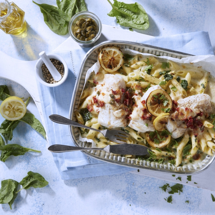 Kabeljau-Rückenfilets waschen, trocken tupfen, mit Zitronensaft beträufeln, mit Salz und Pfeffer würzen und auf die Penne legen. Mit der Mozzarella-Tomaten-Kapern-Mischung bestreuen und im vorgeheizten Backofen bei 180 °C Ober-/Unterhitze Eco (160 °C Heißluft Eco) ca. 25 - 35 Minuten garen.
