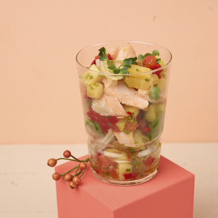 Seesaiblingsfilets mit Salz, Pfeffer und Zitronensaft würzen. Auf ein Backblech legen, mit Frischhaltefolie abdecken und bei 80 °C Ober-/Unterhitze ca. 10 Minuten im Ofen garen. Die Filets in Stücke zupfen und vorsichtig unter den Salat heben.