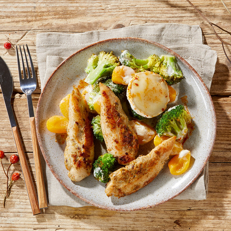 Knusprige Hähnchen-Innenfilets mit Broccoli-Aprikosen-Auflauf