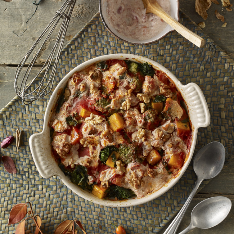 Nun füllen Sie den Blattspinat mit den Kürbiswürfeln und dem Broccoli in die Auflaufform. Gießen Sie den Tomatensaft über das Gemüse, und verteilen Sie die Ricotta-Knoblauch-Tomaten darüber.