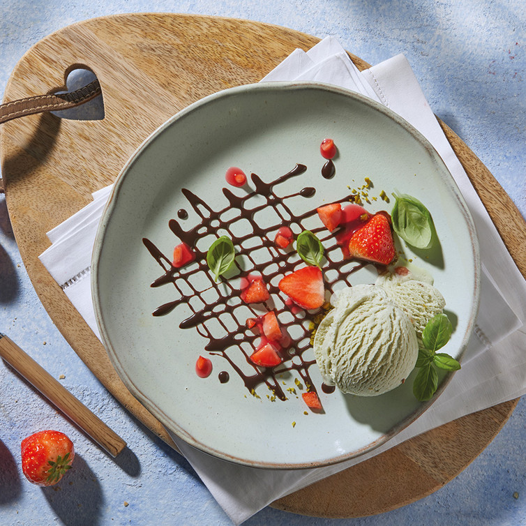 Eine große Kugel Pistazieneis auf die Erdbeeren setzen und mit Basilikumcreme, Basilikumblättchen und Hohlhippe dekoriert servieren.