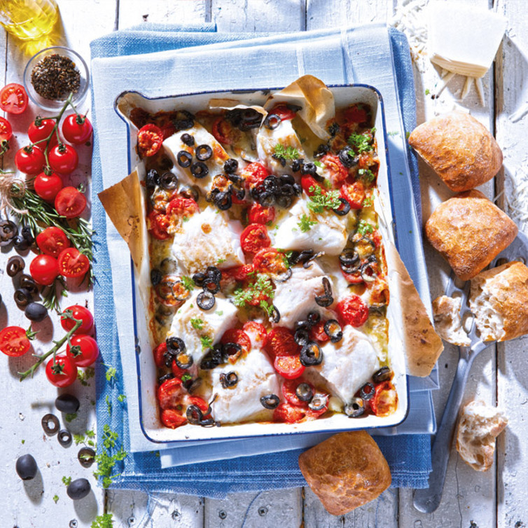 Die Cherry-Tomaten halbieren, die Oliven abtropfen lassen und beides auf dem Fisch verteilen. Das Ganze leicht mit Salz und frischem Pfeffer verfeinern und mit frischem, geriebenem Parmesan und Mozzarella bestreuen.