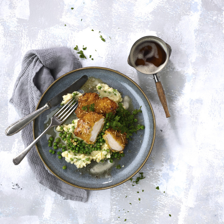 Mini-Hähnchenschnitzel auf Kartoffel-Erbsen-Stampf